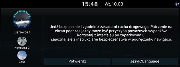 - Naciśnij przycisk uruchamiający silnik, bądź ustaw kluczyk stacyjki zapłonowej w pozycji On lub ACC On. Po włączeniu rozpocznie się proces ładowania systemu i wyświetlona zostanie strona z ostrzeżeniem dotyczącym bezpieczeństwa.
