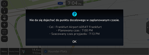 Podczas wyznaczania celu podróży i nawigowania po trasie szacowany czas przybycia jest późniejszy niż informacja o wyznaczonym czasie; użytkownikowi przekazana zostanie informacja o możliwym opóźnieniu.