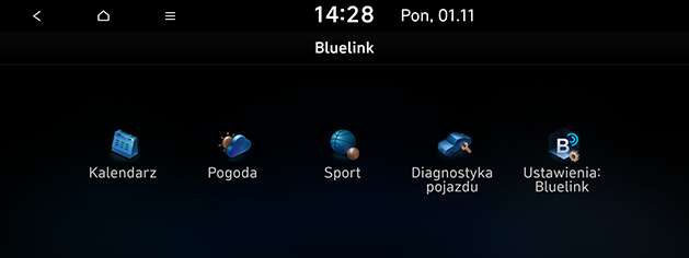 Użyj funkcji Bluelink, takich jak Kalendarz, Pogoda, Diagnostyka pojazdu i Ustawienia Bluelink. Aby korzystać z funkcji Bluelink, należy najpierw aktywować usługę. Za korzystanie z usługi Bluelink może być pobierana oddzielna opłata, a funkcje usługi mogą się różnić w zależności od posiadanego planu usługi.