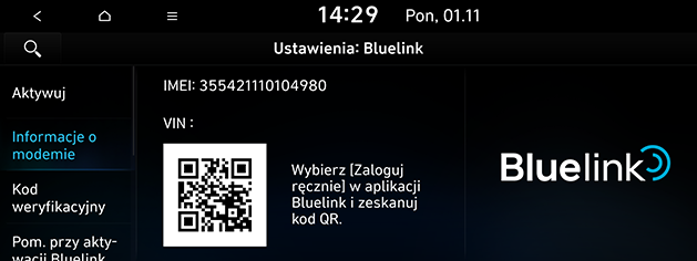 ] > [Bluelink] > [Ustawienia Bluelink] > [Informacje o modemie].