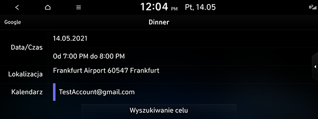 Jeśli na ekranie szczegółów harmonogramu znajdują się informacje o miejscu, są one wyszukiwane przez nawigację po wybraniu przez użytkownika przycisku wyszukiwania miejsca docelowego.