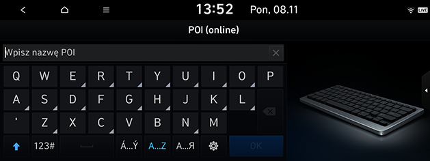 ] > [Hyundai LIVE] > [POI na żywo]. - Wpisz nazwę żądanego punktu POI (Punktu zainteresowania) i naciśnij [OK].