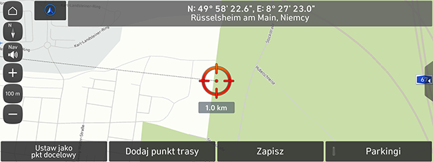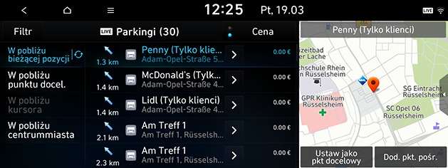 ] > [Hyundai LIVE] > [Parkingi na żywo] > [W pobliżu kursora]. - Wybierz żądane miejsce docelowe.