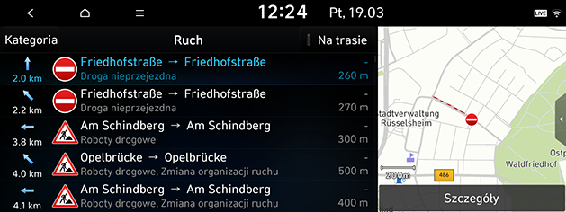 Wyświetlana jest lista informacji dotyczących bieżącego ruchu drogowego/sytuacji na drogach. Ta funkcja może nie być widoczna w zależności od warunków.