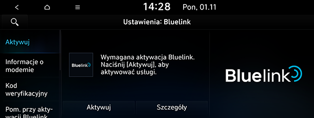 - [Aktywuj]: To menu służy do aktywacji usługi Bluelink.