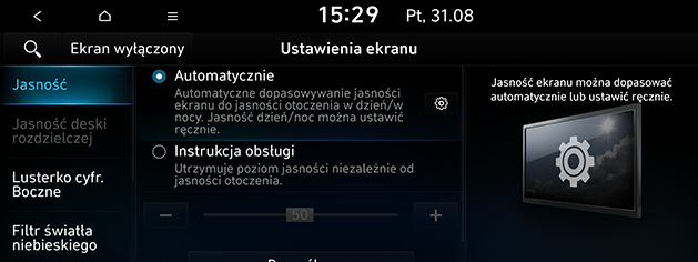 To menu służy do regulacji jasności i trybu przygaszenia dla całego systemu. W zależności od modelu, wyposażenia opcjonalnego i kraju niektóre z przedstawionych funkcji i obrazów mogą się różnić od rzeczywistych.