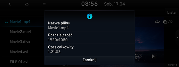 Ta funkcja pokazuje nazwę, rozdzielczość i czas odtwarzania danego pliku.