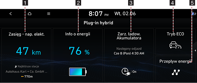 Menu hybrydy plug-in składa się z pięciu sekcji: [Zasięg - nap. elekt.], [Info o energii], [Zarz. łądow. Akumulatora], [Tryb ECO], [Przepływ energii].