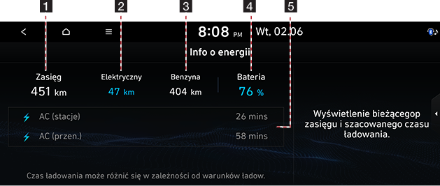 5 Wyświetla oczekiwany czas ładowania po podłączeniu kabla ładowania.