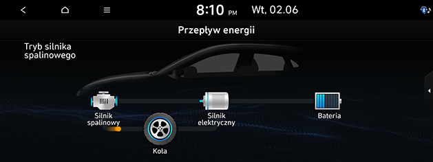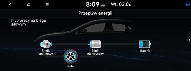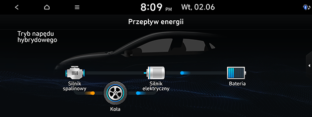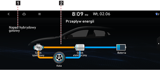 1 Wyświetla stan jazdy pojazdu hybrydowego.