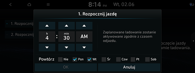 - [Powtórz]: Wybierz dzień tygodnia, w którym ma się odbywać ładowanie.