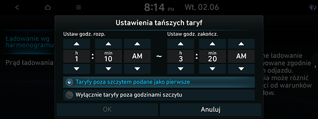 - [Taryfy poza szczytem podane jako pierwsze]: Ładowanie rozpoczyna się z uwzględnieniem zaplanowanego czasu ładowania.