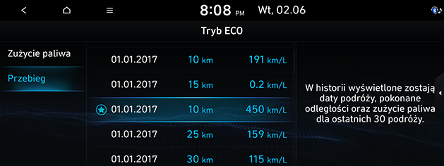 Służy od wyświetlania daty, odległości i oszczędzania paliwa poprzedniej historii jazdy.