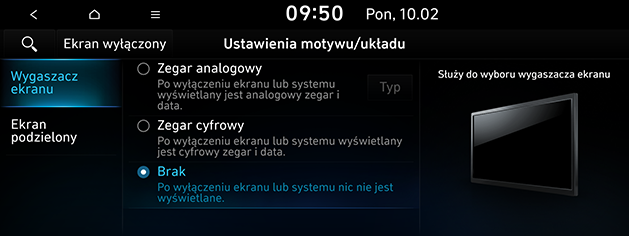 - [Wygaszacz ekranu]: Służy do wybierania wygaszacza ekranu. Jako wygaszacz ekranu można wybrać [Zegar analogowy], [Zegar cyfrowy] lub [Brak].