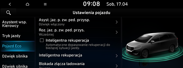 - [Rekup. zgodna z mapą]: System automatycznie reguluje zwalnianie pojazdu w oparciu o atrybuty drogi na trasie nawigacji.