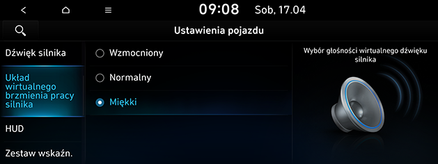 - Wybierz żądane pozycje. Dla trybu dźwięku silnika można wybrać ustawienie [Wzmocniona], [Normalna], [Zmniejszona]lub [Wył.].