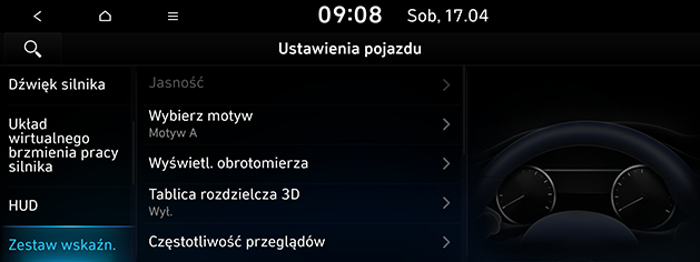 - [Jasność]: Umożliwia ustawienie jasności zestawu wskaźników.