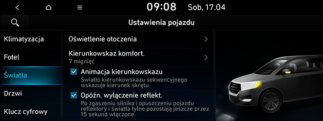 - Naciśnij [SETUP] > [Pojazd] > [Światła].