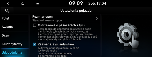 - Naciśnij [SETUP] > [Pojazd] > [Udogodnienia].