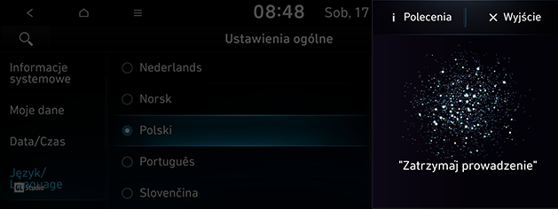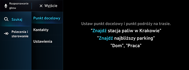 - Polecenia nawigacji z wyjątkiem „Adres wyszukiwania/Znajdź POI/Znajdź <kategorię>” są obsługiwane w języku greckim, portugalskim, polskim, szwedzkim, tureckim, czeskim, duńskim i norweskim. Zmień język systemu na inny.