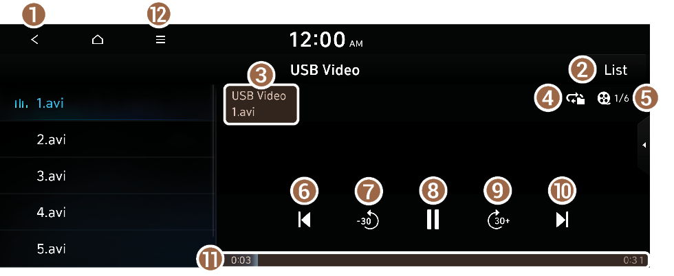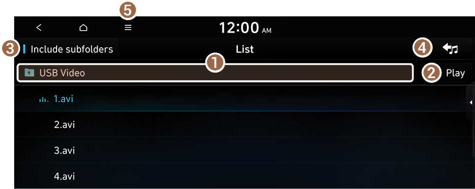 You can search and play the desired video from the list by pressing List on the USB video playback screen.