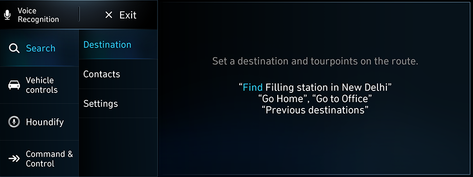 Navigation commands | Run navigation, and set a destination or waypoints. | Find POI Go home/Go to office Recalculate |