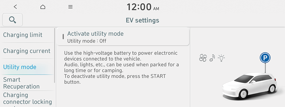 Turns on utility mode. When this function is on, electric systems on the vehicle are operated using the driving (high-voltage) battery.