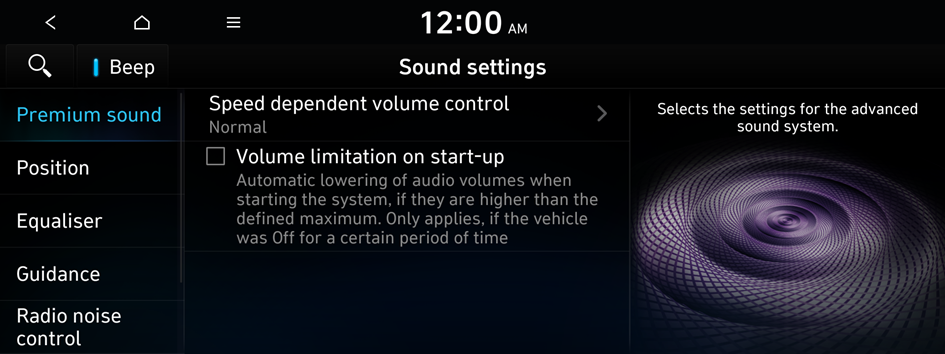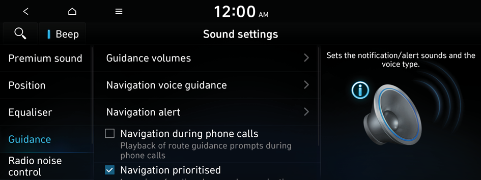 Specify the system's guidance voice type, set a certain sound to override other sounds, and configure other guidance sound settings.