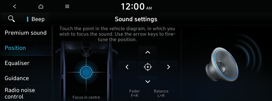 You can select a position where sound is more audible in the vehicle. By pressing the desired point on the seat image or pressing the arrow buttons, you can finely adjust the position. To concentrate the sound to the centre of the vehicle, press