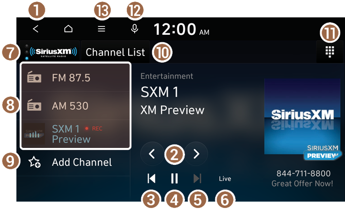icon appears next to the first 10 SiriusXM channels saved. Once preset channels have been saved, the broadcasts from them are buffered automatically for your convenience each time you start the vehicle.You can select a channel from available SiriusXM channels.