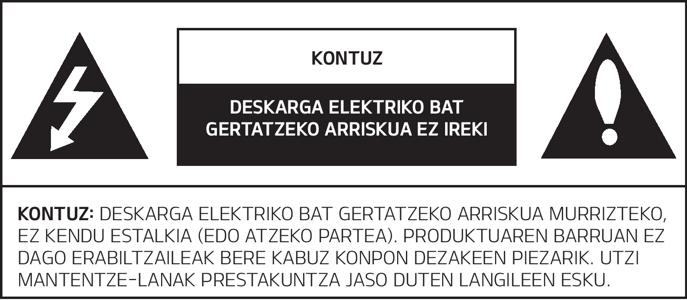 Deskarga elektriko baten arriskua murrizteko, ez kendu produktu honen estalkia edo atzeko atala. Produktuaren barruan ez dago erabiltzaileak bere kabuz konpon dezakeen piezarik. Utzi mantentze-lanak prestakuntza jaso duten langileen esku.