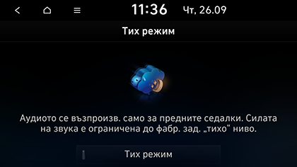 В този режим радио/мултимедия се възпроизвежда само на предната седалка. За да включите тих режим, натиснете Тих режим. Натиснете отново, за да изключите.