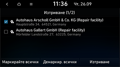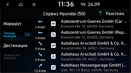 Маршрут: Търси сервизи на Hyundai по протежение на текущия маршрут. Достъпно само когато дестинацията е зададена.
