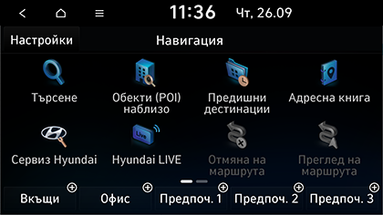 Дестинация: Търси сервизи на Hyundai в близост до текущата дестинация. Достъпно само когато дестинацията е зададена.