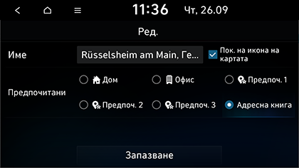 Запазване на местополож.: Добавя това местоположение в Адресна книга. Преминава към екрана за редактиране на адресната книга.