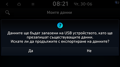 Натиснете SETUP > Навигация > Автоматизирани функции > Моите данни > Експортиране на любими и предишни дестинации на USB.