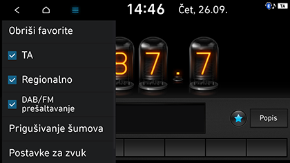 ] > Postavke za zvuk na zaslonu radija. Za više informacija, pogledajte odjeljak „Audio“.