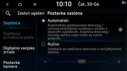 Digitalno vanjsko zrcalo (ako postoji): Postavlja svjetlinu digitalnih bočnih ogledala vozača i suvozača.