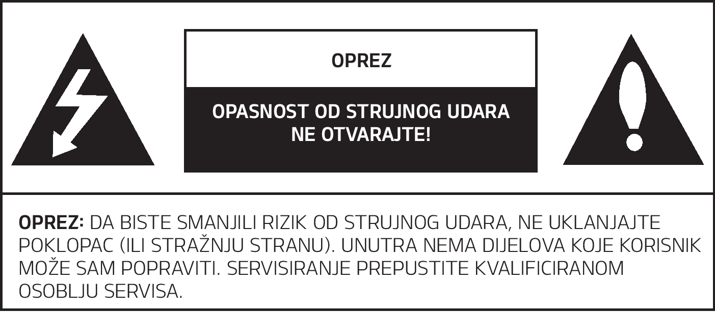 Da biste smanjili rizik od strujnog udara, ne uklanjajte poklopac ili stražnju stranu ovog proizvoda. Unutra nema dijelova koje korisnik može sam popraviti. Servisiranje prepustite kvalificiranom osoblju servisa.