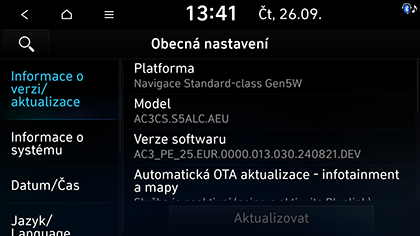 Můžete zobrazit verzi softwaru, verzi firmwaru, verzi aplikace navigace, verzi mapy a ID zařízení.