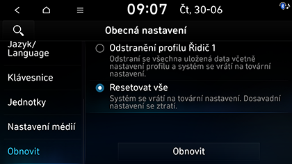 Můžete resetovat aktuální profil nebo celý systém. Zvolte požadovanou položku a stiskněte Obnovit > Ano.