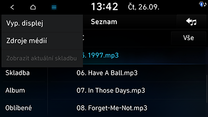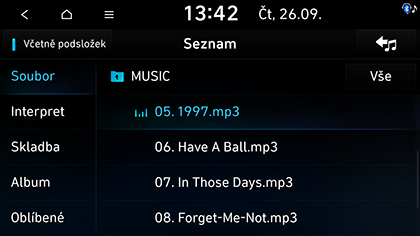 Kategorie lze třídit podle položek Soubor, Interpret, Skladba, Album nebo Oblíbené.