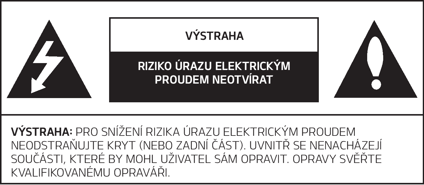 Symbol blesku se šipkou, který je uvnitř rovnostranného trojúhelníku, má za cíl varovat uživatele před přítomností neizolovaného nebezpečného napětí uvnitř krytu výrobku, které může být natolik vysoké, aby představovalo riziko úrazu elektrickým proudem.
