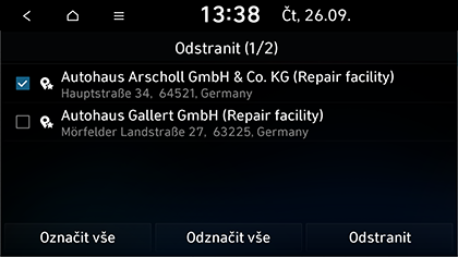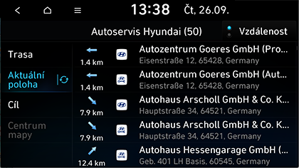 Trasa: Vyhledá servisy Hyundai podél aktuální trasy. K dispozici pouze v případě, že je nastaven cíl.