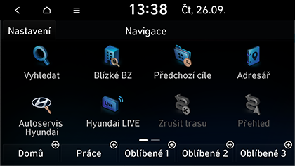 Cíl můžete nastavit pomocí klávesové zkratky. Stiskněte tlačítko NAV a vyberte požadované místo z tlačítka Domů, Práce, Oblíbené 1, Oblíbené 2 nebo Oblíbené 3 ve spodní části obrazovky.