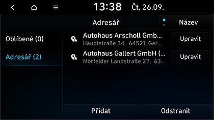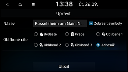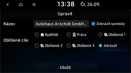 Stisknutím tlačítka NAV > Adresář > Oblíbené a výběrem požadované položky uložíte místo. Nebo stiskněte NAV > Adresář > Adresář > Přidat.