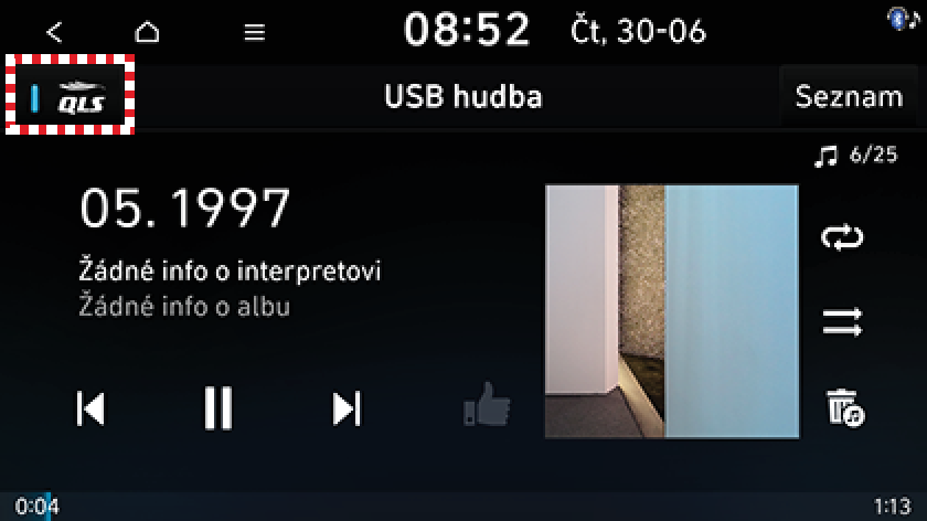Prolínání/vyvážení: Tato nabídka umožňuje nastavit polohu zvuku. Můžete nastavit zvuk do blízkosti sedadla řidiče tak, aby byla hlasitost relativně nižší u sedadla spolujezdce nebo zadních sedadlech.