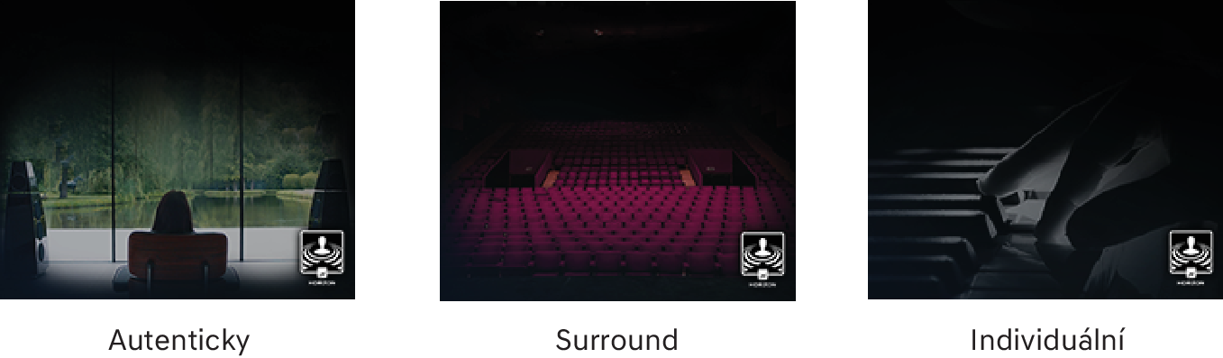Na pódiu: Poskytuje zážitek z prostorového zvuku, který posluchače přenese na pódium s jeho oblíbenými umělci, přičemž jednotlivé nástroje a hudební prvky jsou rozmístěny po celé kabině.