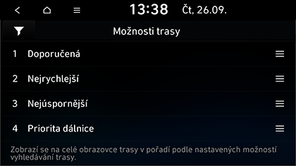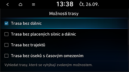 Můžete upravit různé možnosti trasy podle vašich potřeb. Ujistěte se, že je systém připojen k síti. Možnost Možnosti trasy je k dispozici pouze v případě, že je nastaven cíl.