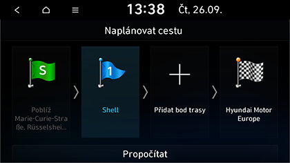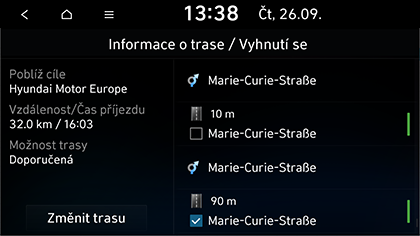 Tato funkce vám umožní zobrazit vzdálenost k následujícímu vodicímu bodu a změnu směru ve vodicím bodu. A díky dopravním podmínkám se můžete vyhnout určitým ulicím. Můžete vypočítat alternativní trasu od polohy vozidla do cíle.